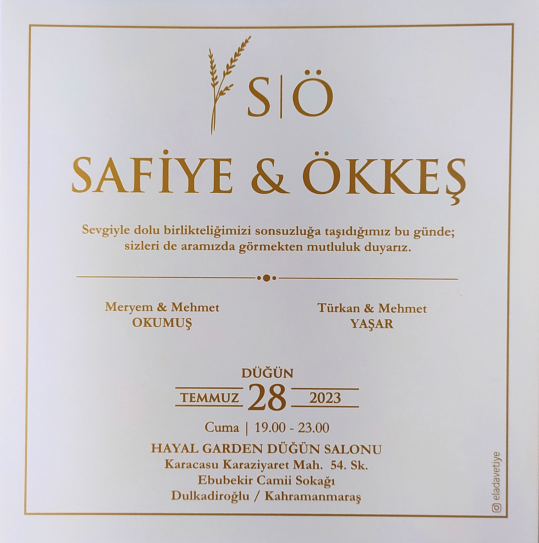 Personel Daire Başkanlığı personeli Mehmet OKUMUŞ'un kızı, 28 Temmuz 2023 Cuma günü saat 19.00'da Hayal Garden Düğün Salonunda düzenlenecek düğün töreni ile dünya evine girecektir. Okumuş ailesini ve genç çifti tebrik eder, mutluluklar dileriz.