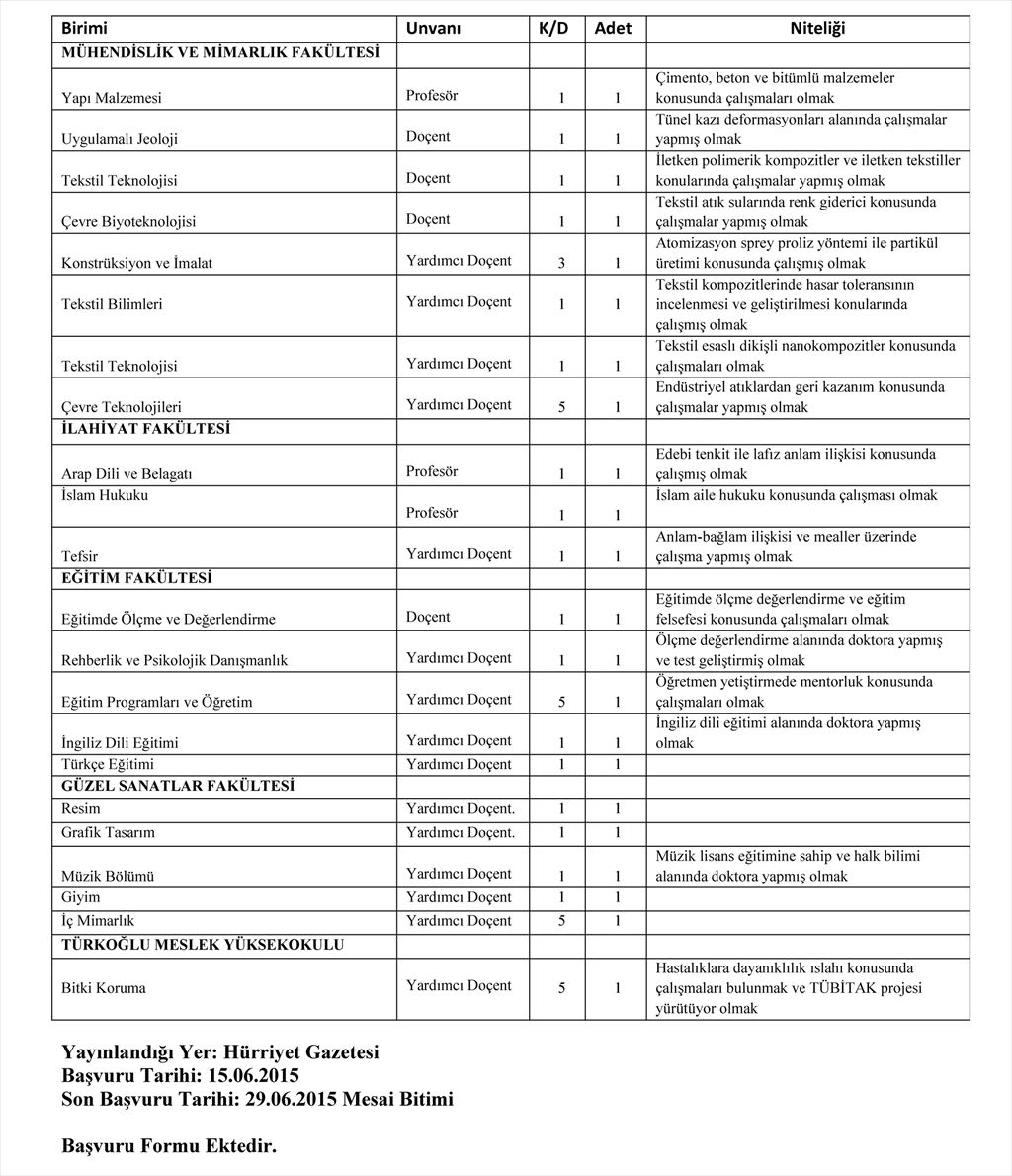 Profesör, Doçent ve Yardımcı Doçent Alım İlanı