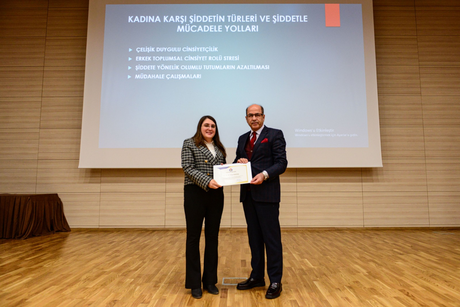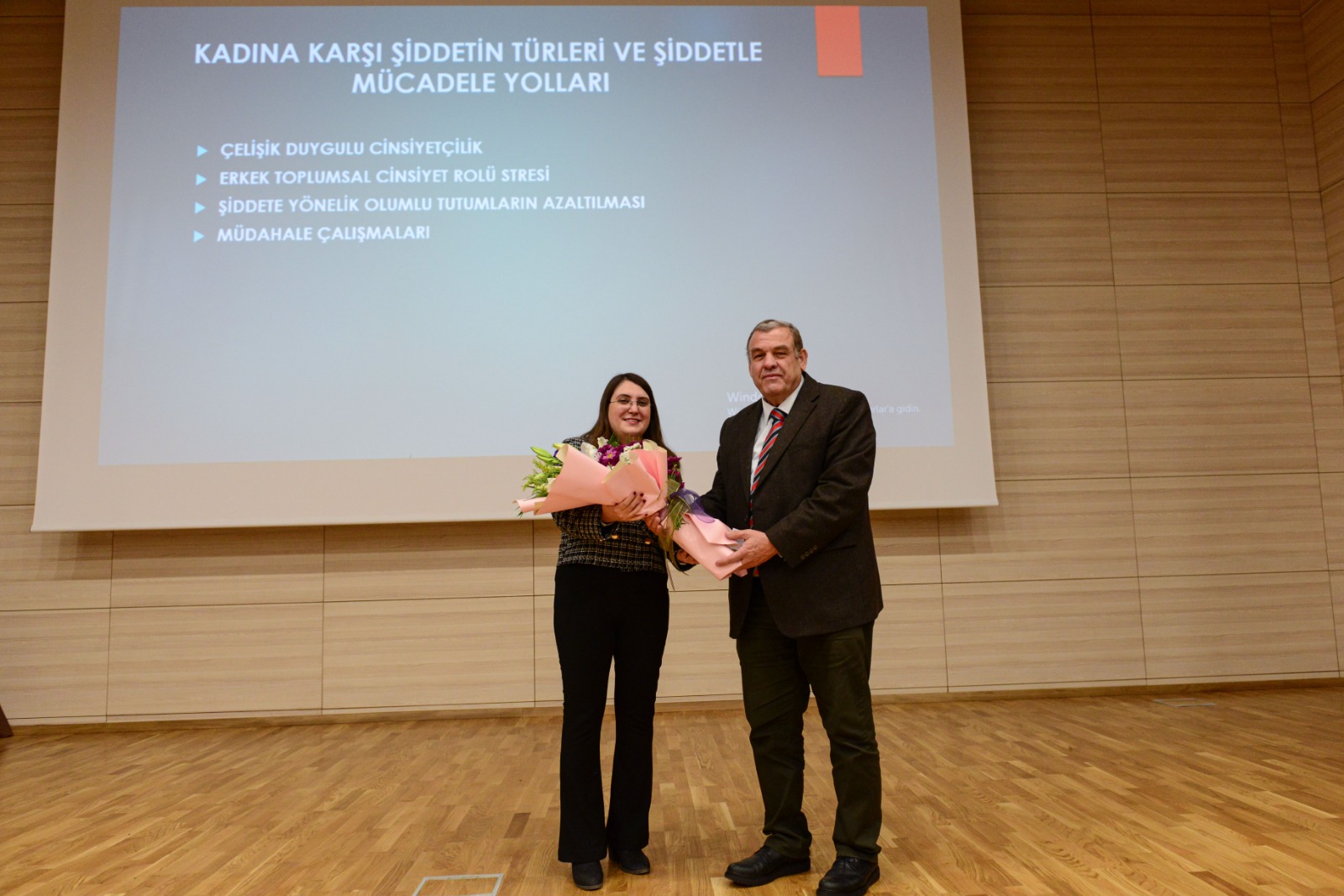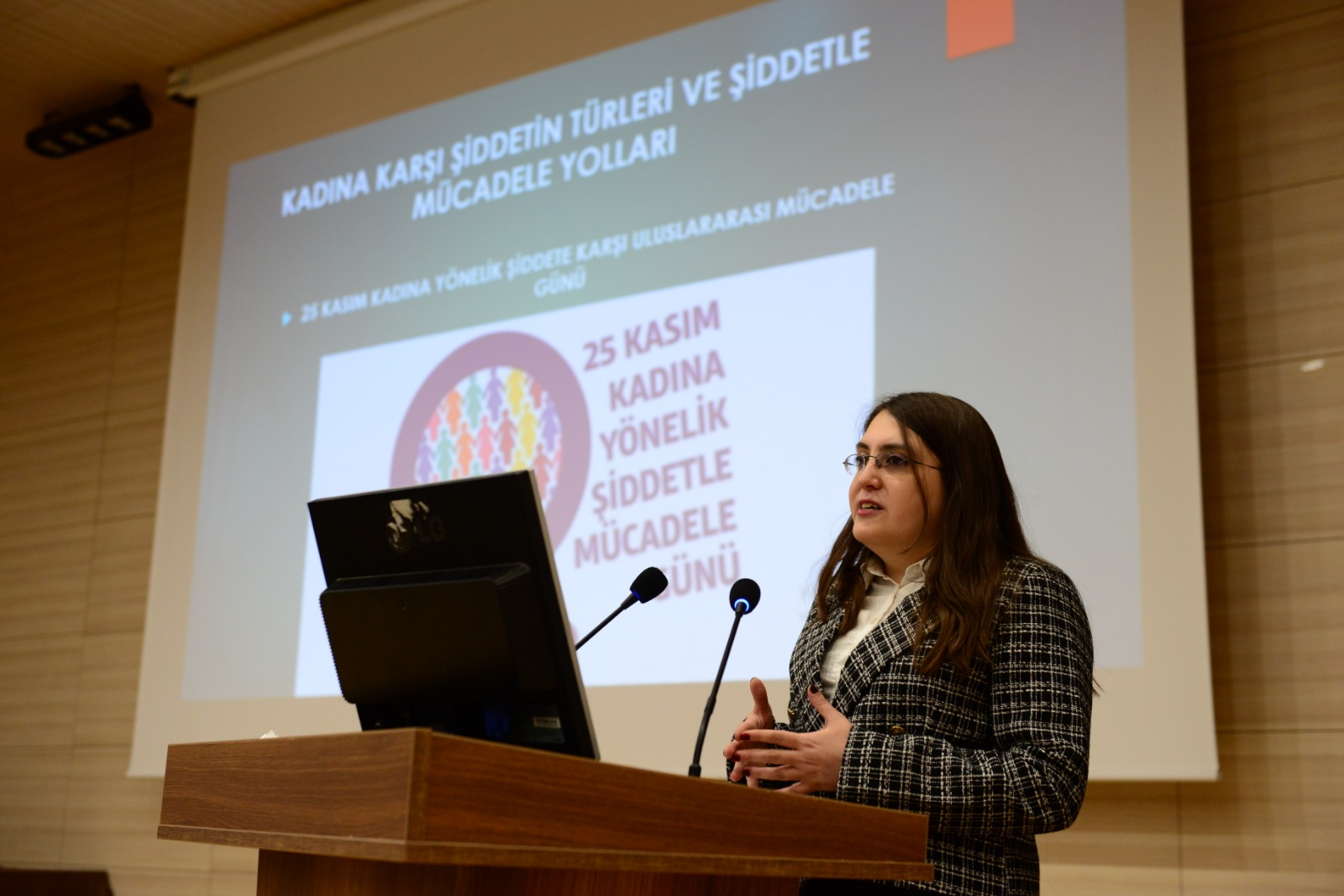 Açılış konuşmasının ardından ‘Kadına Karşı Şiddetin Türleri ve Şiddetle Mücadele Yolları’ konulu sunumunu yapmak üzere kürsüye gelen İnsan ve Toplum Bilimleri Fakültesi Psikoloji Bölümü Araştırma Görevlisi Dr. Derya Karataş ise 25 Kasım’ın kadına yönelik şiddetle mücadele günü olarak seçilme nedeninden, şiddet türlerinden, psikolojik şiddet ve sebeplerinden, şiddet ile mücadele yollarından bahsetti.