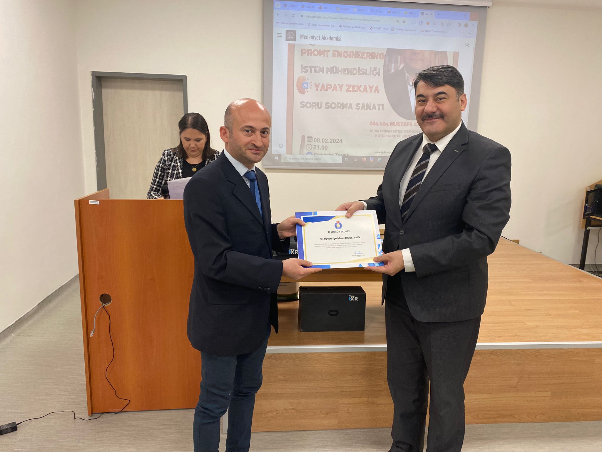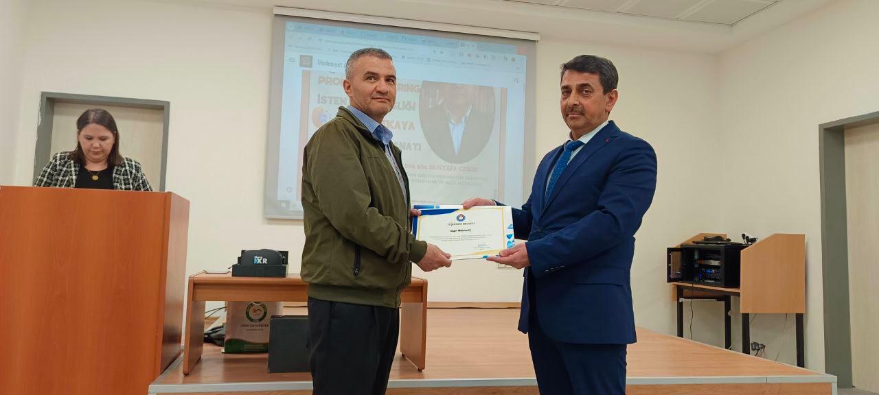 Söyleşinin sonrasında bir yılda en çok kitap okuyan akademik ve idari personel ile öğrencilere çeşitli hediyeler verildi. Dekanımız da programda en çok kitap okuyan akademik persenel Dr. Öğr. Üyesi Ahmet Hikmet Zabun’a teşekkür belgesi takdim etti.