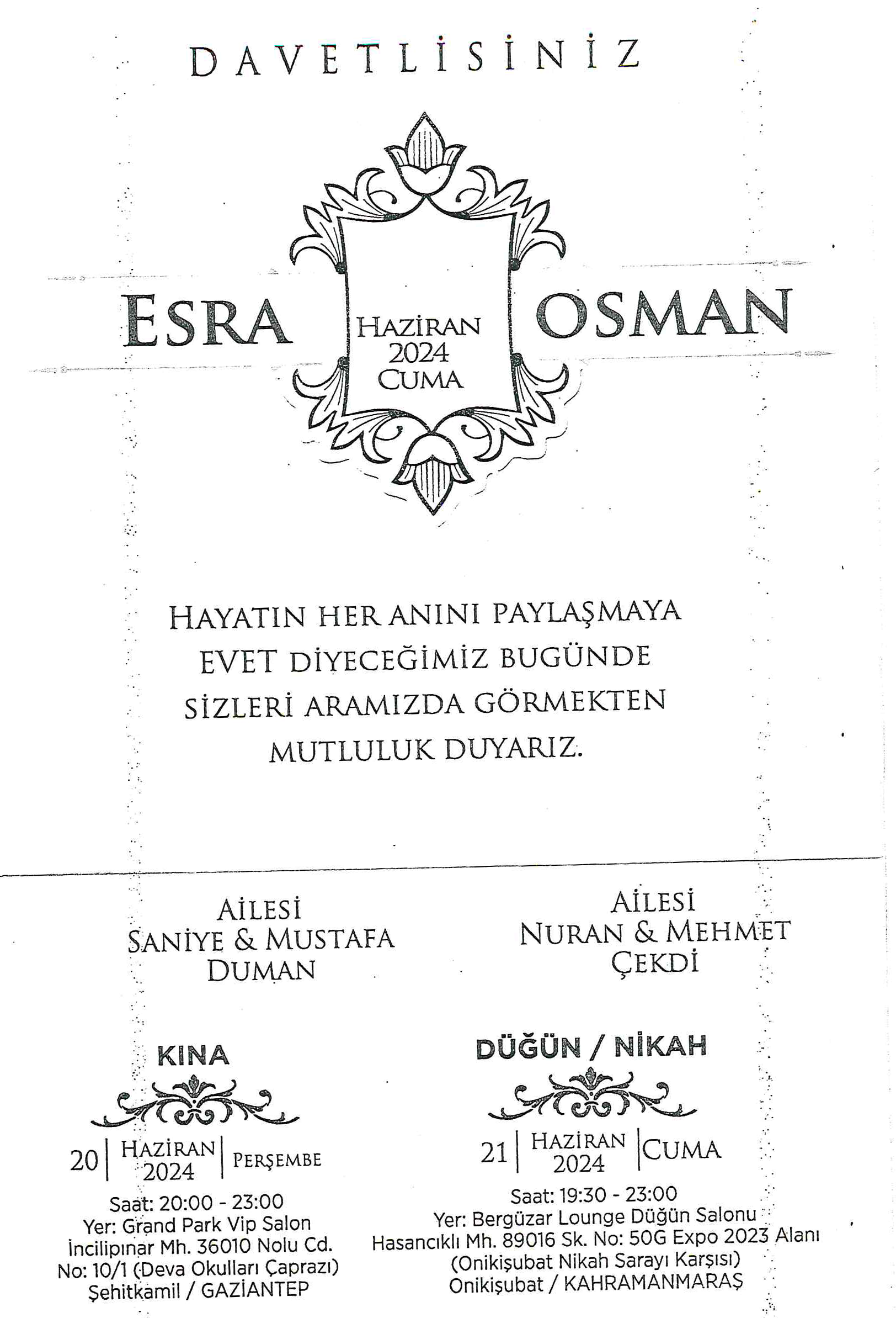 Teknik Bilimler Meslek Yüksekokulu personeli Mehmet ÇEKDİ’nin oğlu, 21 Haziran 2024 Cuma günü (Saat:19.30 – 23.00) Bergüzar Lounge Düğün Salonunda (EXPO 2023 Alanı) düzenlenecek düğün töreni ile dünya evine girecektir. ÇEKDİ ailesini ve genç çifti tebrik eder, mutluluklar dileriz.