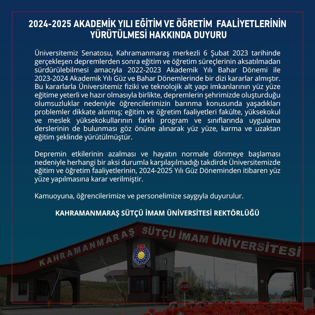 Depremin etkilerinin azalması ve hayatın normale dönmeye başlaması nedeniyle herhangi bir aksi durumla karşılaşılmadığı takdirde Üniversitemizde eğitim ve öğretim faaliyetlerinin, 2024-2025 Yılı Güz Döneminden itibaren yüz yüze yapılmasına karar verilmiştir.