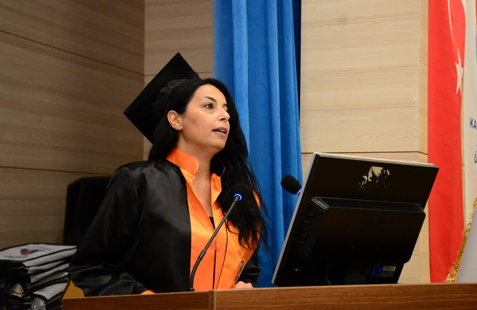 Saygı Duruşu ve İstiklal Marşı’nın okunmasının ardından Fakülte dönem birincimiz Yasemin AKBALABAN konuşmalarını yaptı.