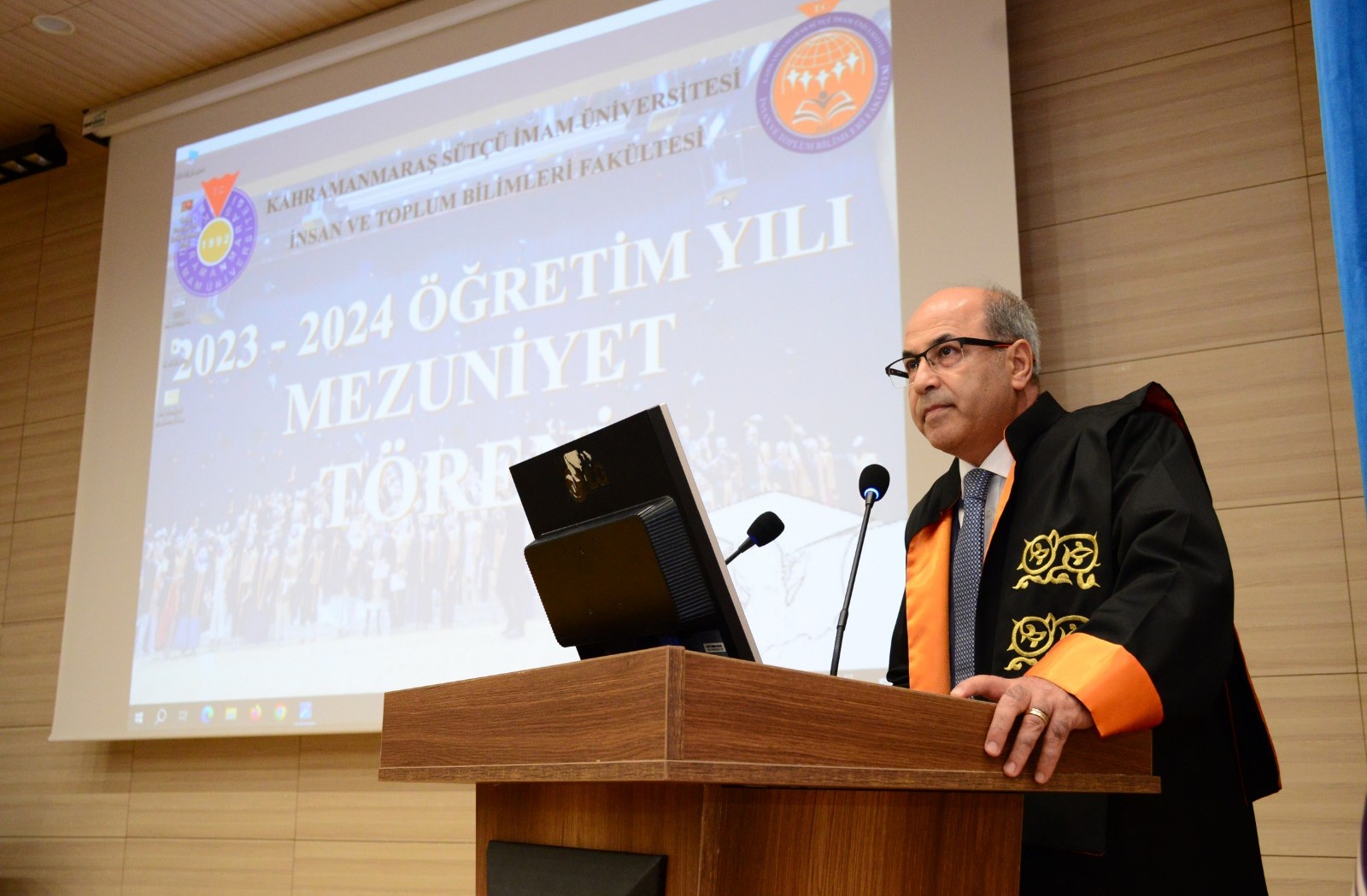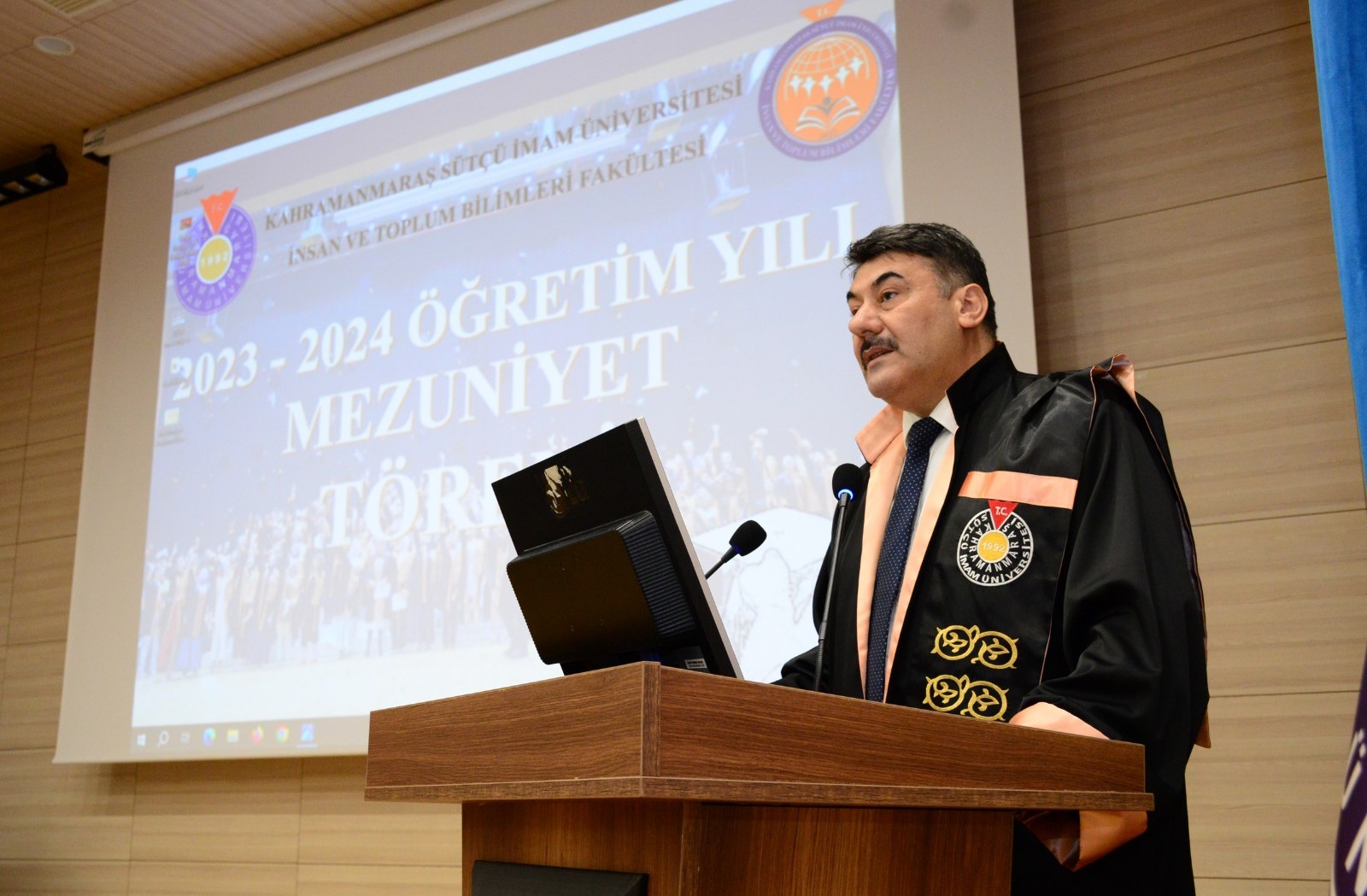 Program, Fakültemiz Dekanı Prof. Dr. Yakup POYRAZ’ın açılış konuşmaları ile devam etti. Dekanımız konuşmasında mezunlarımıza hitaben, “Sevgili öğrenciler, eğitim hayatınızı başarıyla tamamladınız ve Kahramanmaraş Sütçü İmam Üniversitesi mezunları arasına katıldınız. Artık yeni bir hayata adım atıyorsunuz. Yeni hayatınızda kendiniz, aileniz ve ülkemize karşı sorumluluklarınızın olduğu bilinciyle doğruluktan ayrılmadan, vicdanınızla, bilimle ve aklınızla hareket etmenizi diliyorum. Sizlerin başarılı olacağına olan inancımız tamdır. Bu süreçte elde edeceğiniz başarı ve toplumsal katkı siz ve aileniz kadar mensubu olduğunuz Kahramanmaraş Sütçü İmam Üniversitesi’ni ve hocalarınızı onurlandıracaktır.