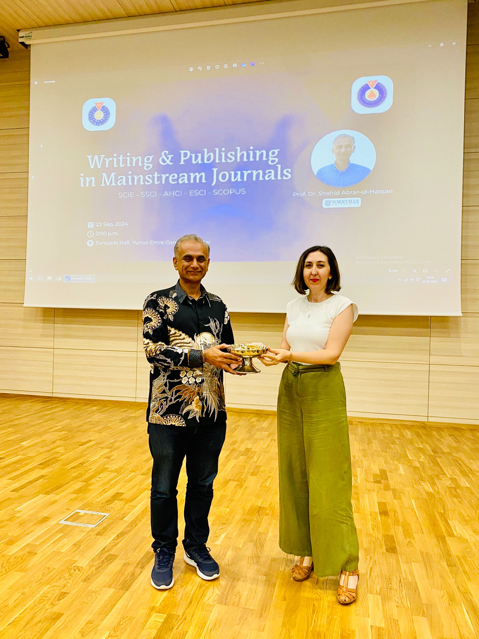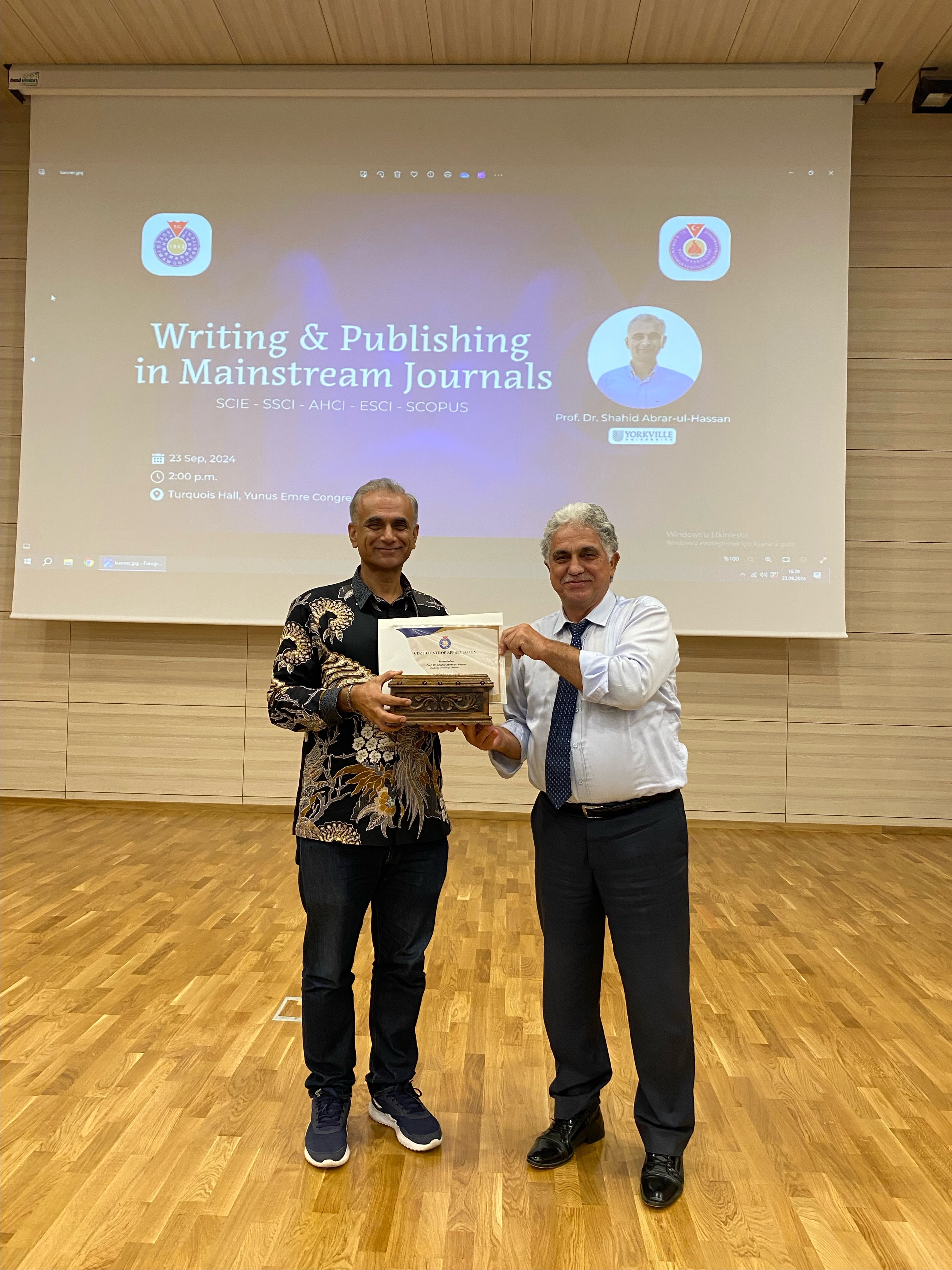 SSCI endeksinde Q1 düzeyde taranan birçok dergide editörlük görevi bulunan Prof. Shahid ABRAR-UL-HASSAN, Web of Science veri tabanında yer alan dergiler ile diğer üst düzey bilimsel dergilerde yayın yapabilmek için dikkat edilmesi gereken hususlara değinerek etkinlik sonunda katılımcıların sorularını yanıtladı. Etkinlik sonunda Prof. Shahid ABRAR-UL-HASSAN'a Fakülte Dekanımız Prof. Dr. Mustafa YAZICI ve Yabancı Diller Eğtimi Bölüm Başkanı Doç. Dr. Reyhan AĞÇAM tarafından Teşekkür Belgesi ve hediyeler takdim edildi.