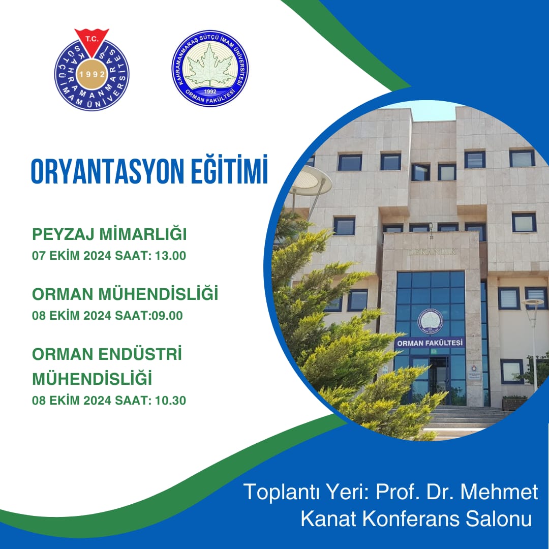 Orman Fakültesi; Orman Mühendisliği, Orman Endüstri Mühendisliği ve Peyzaj Mimarlığı Bölümlerinde eğitim gören birinci ve ikinci sınıf öğrencilerimize yönelik Prof.Dr. Mehmet Kanat Konferans Salonunda "Oryantasyon Eğitimi ve Bilgilendirme Toplantısı" gerçekleştirilecektir.