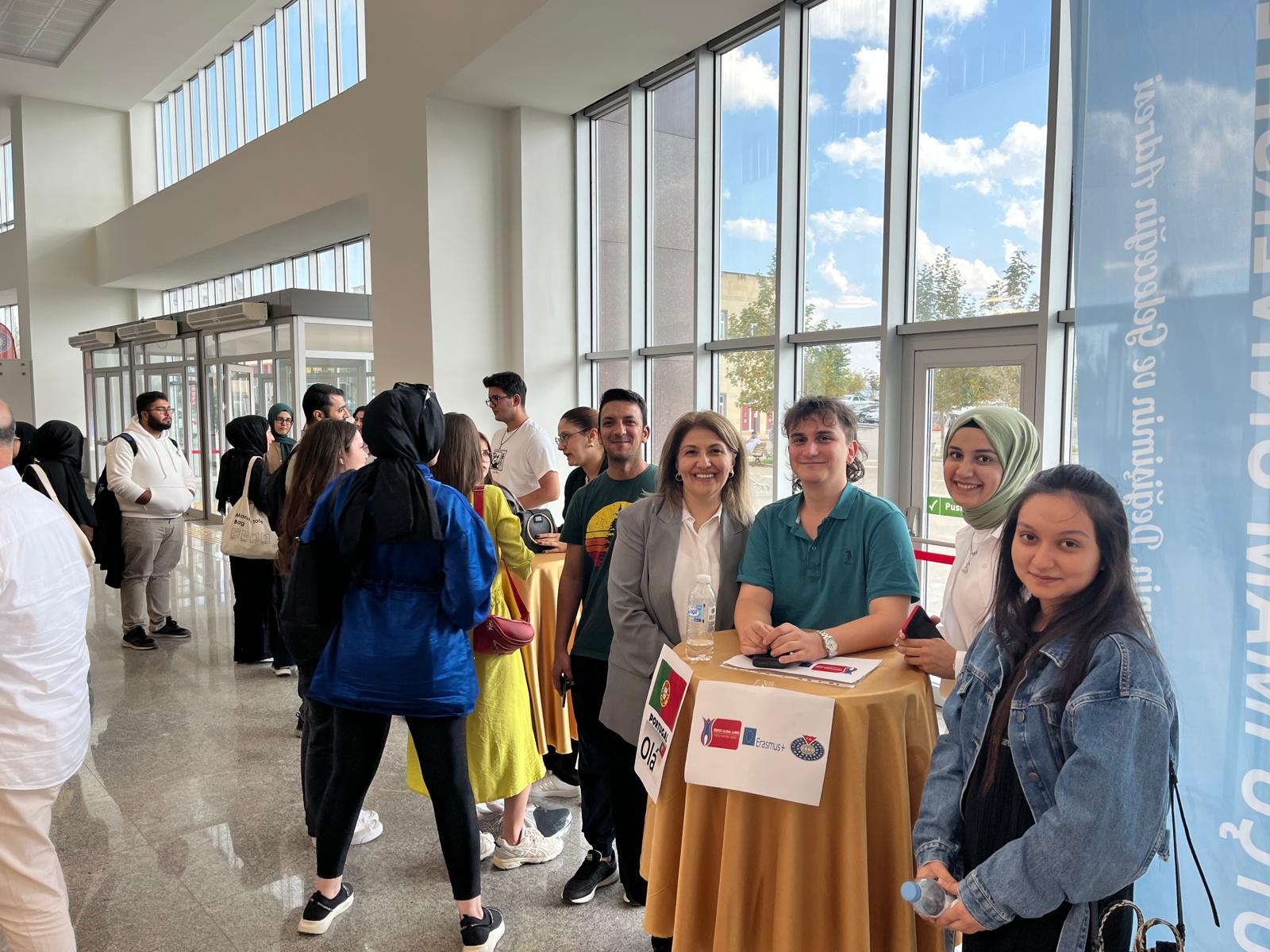 Öğrenci oturumu sonrasında Üniversitemizden daha önce Erasmus hareketliliğine katılarak Portekiz, Almanya, Polonya ve İtalya'ya giden öğrencilerimiz Kongre Merkezinde yer alan Fuaye alanına kurulan masalarda ziyaretçilere tecrübe ve bilgi aktarımlarında bulunmuşlardır.
