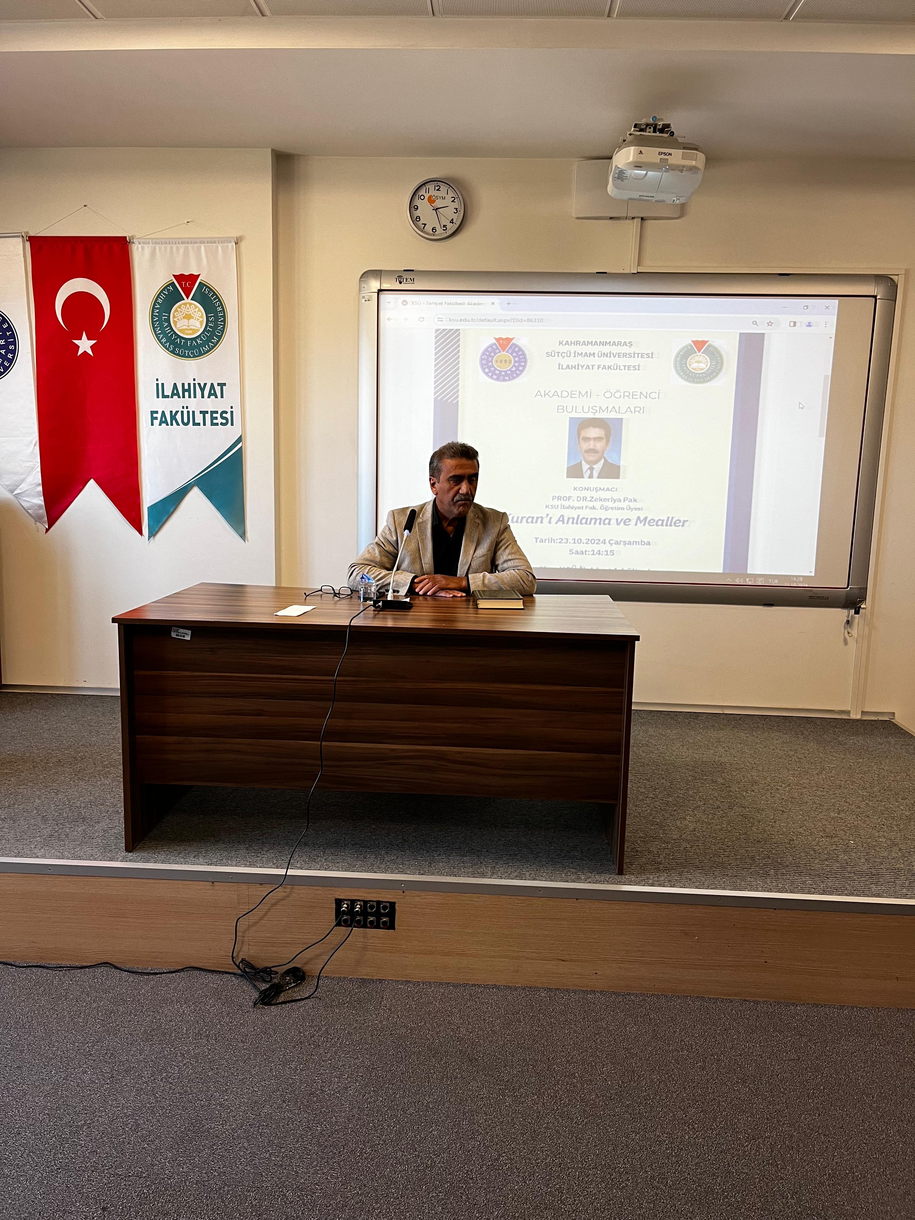 Fakültemiz konferans salonunda Tefsir Anabilin Dalı öğretim üyelerinden Prof Dr. Zekeriya PAK hocamız Akademi-Öğrenci buluşmaları kapsamında "Kuran'ı Anlama ve Mealler" konulu konferans verdi.