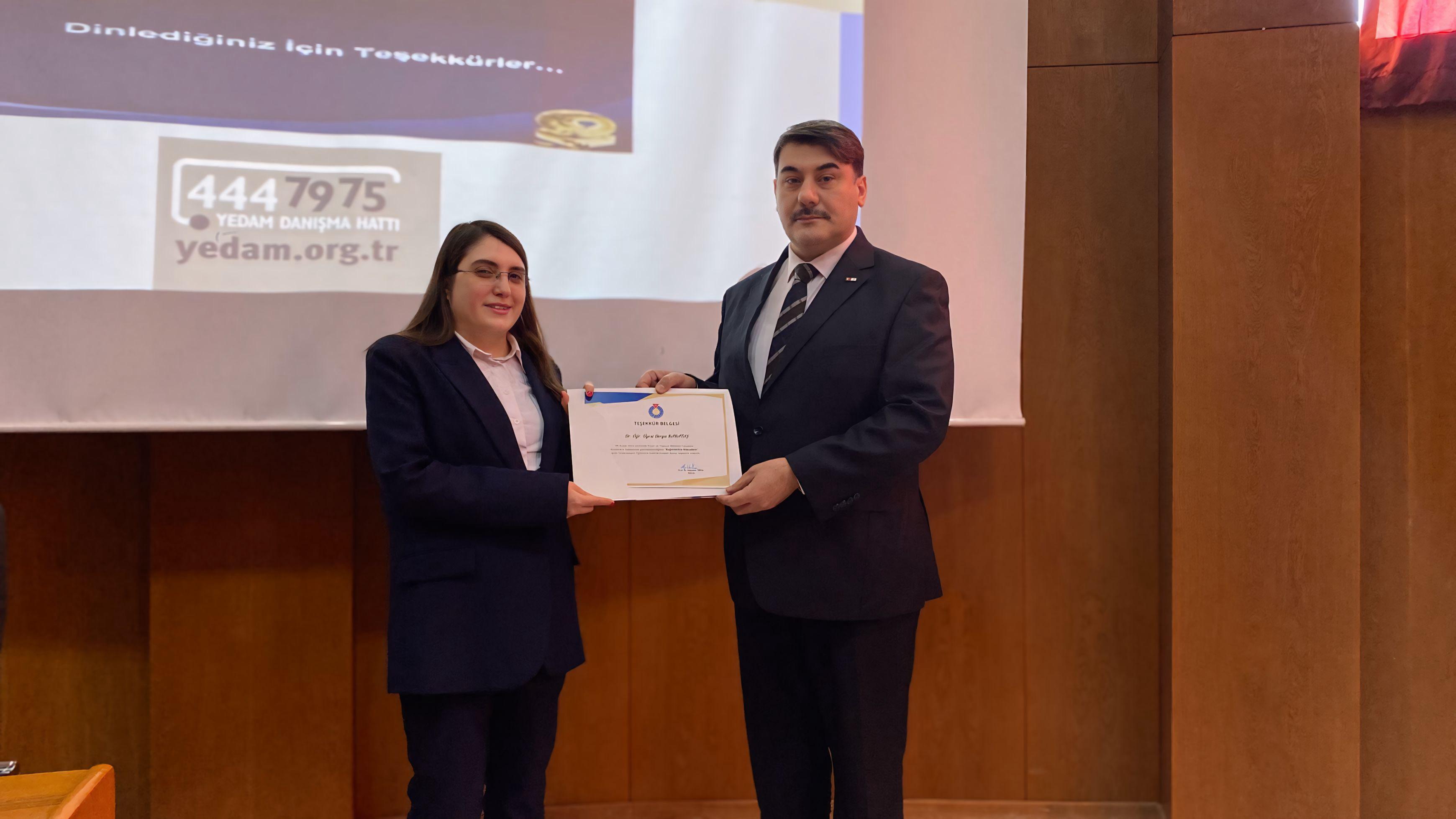 Eğitim programının sonunda, Dekanımız Prof. Dr. Yakup Poyraz tarafından konuşmacı hocamız Dr. Öğr. Üyesi Derya Karataş’a teşekkür belgesi takdim edilerek etkinlik sonlandırıldı. Dekanımız Prof. Dr. Yakup Poyraz, bu tür eğitimlerin, öğrencilerin ve personelin sağlıklı yaşam alışkanlıkları kazanmalarına yardımcı olmasının yanı sıra, bağımlılıkla mücadele konusunda daha bilinçli bir toplum oluşturulmasına katkı sağladığını belirtti.