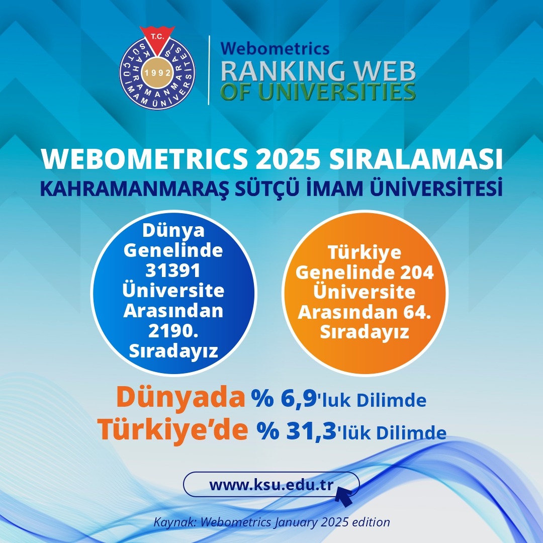 Kahramanmaraş Sütçü İmam Üniversitesi (KSÜ), uluslararası akademik alandaki başarısını sürdürerek Webometrics Ocak 2025 "Ranking Web of Universities" dünya sıralamasında önemli bir başarıya imza attı. 2024 yılı verilerine göre hazırlanan yüzdelik dilimler Ocak 2025 tarihinde değerlendirilerek yayıma alındı. Yayımlanan verilere göre dünya genelinde 31.391 üniversitenin değerlendirildiği sıralamada KSÜ, 2190. sırada yer alarak dünyadaki üniversiteler arasında en iyi %6.9’luk dilime, Türkiye genelinde ise %31.3’lük dilime girmeyi başardı.