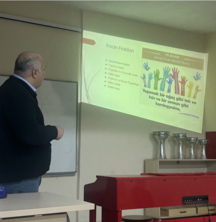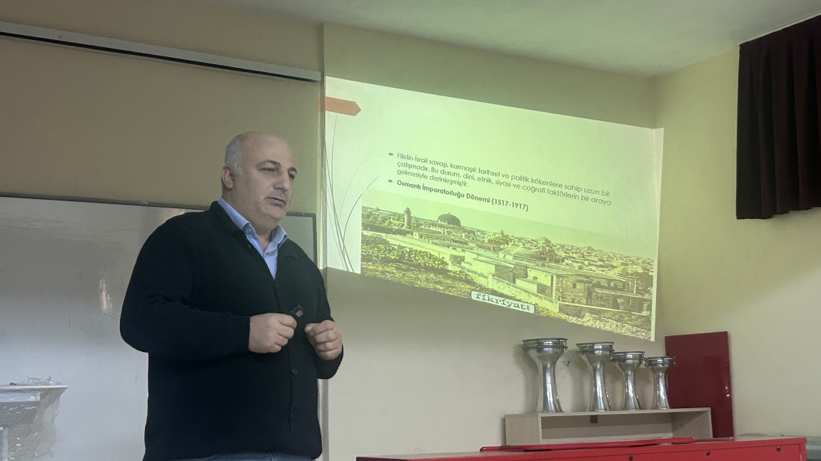 Fakültemiz Kamu Yönetimi Bölümü Öğretim Üyesi Prof. Dr. Aziz Belli tarafından Akedaş Ortaokulu'nda Filistin'de yaşanan "İnsan Hakları İhlalleri" konulu sunum gerçekleştirilmiştir.