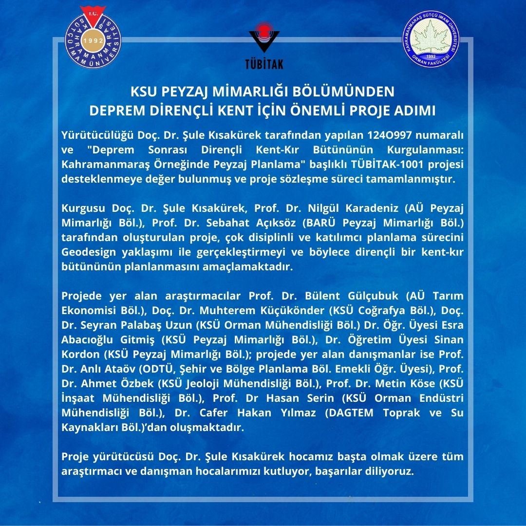 Kahramanmaraş Sütçü İmam Üniversitesi Orman Fakültesi Peyzaj Mimarlığı Bölümü öğretim üyesi Doç. Dr. Şule Kısakürek yürütücülüğünde hazırlanan ve “Deprem Sonrası Dirençli Kent-Kır Bütününün Kurgulanması: Kahramanmaraş Örneğinde Peyzaj Planlama” başlığını taşıyan TÜBİTAK-1001 projesi, 1240997 numara ile desteklenmeye değer bulunmuş ve proje sözleşme süreci tamamlanmıştır.