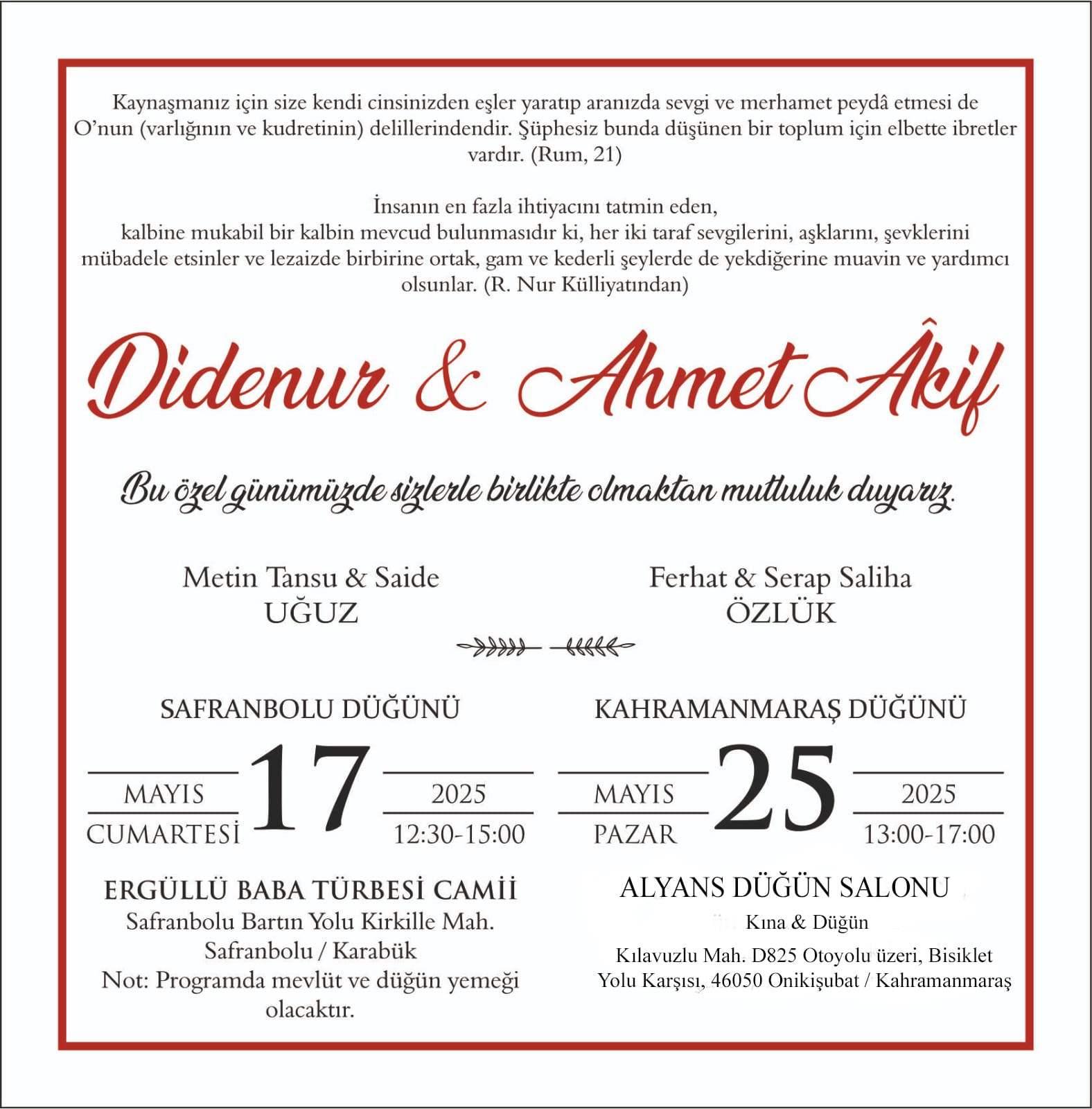 Kahramanmaraş Sağlık Hizmetleri Meslek Yüksekokulu Tıbbi Hizmetler ve Teknikler Bölümü Dr. Öğr. Üyesi Metin Tansu Uğuz'un kızı 25/05/2025 pazar günü saat 13:00'de Alyans Düğün Salonunda düzenlenecek düğün töreni ile dünya evine girecektir. Uğuz Ailesini ve genç çifti tebrik eder, mutluluklar dileriz.