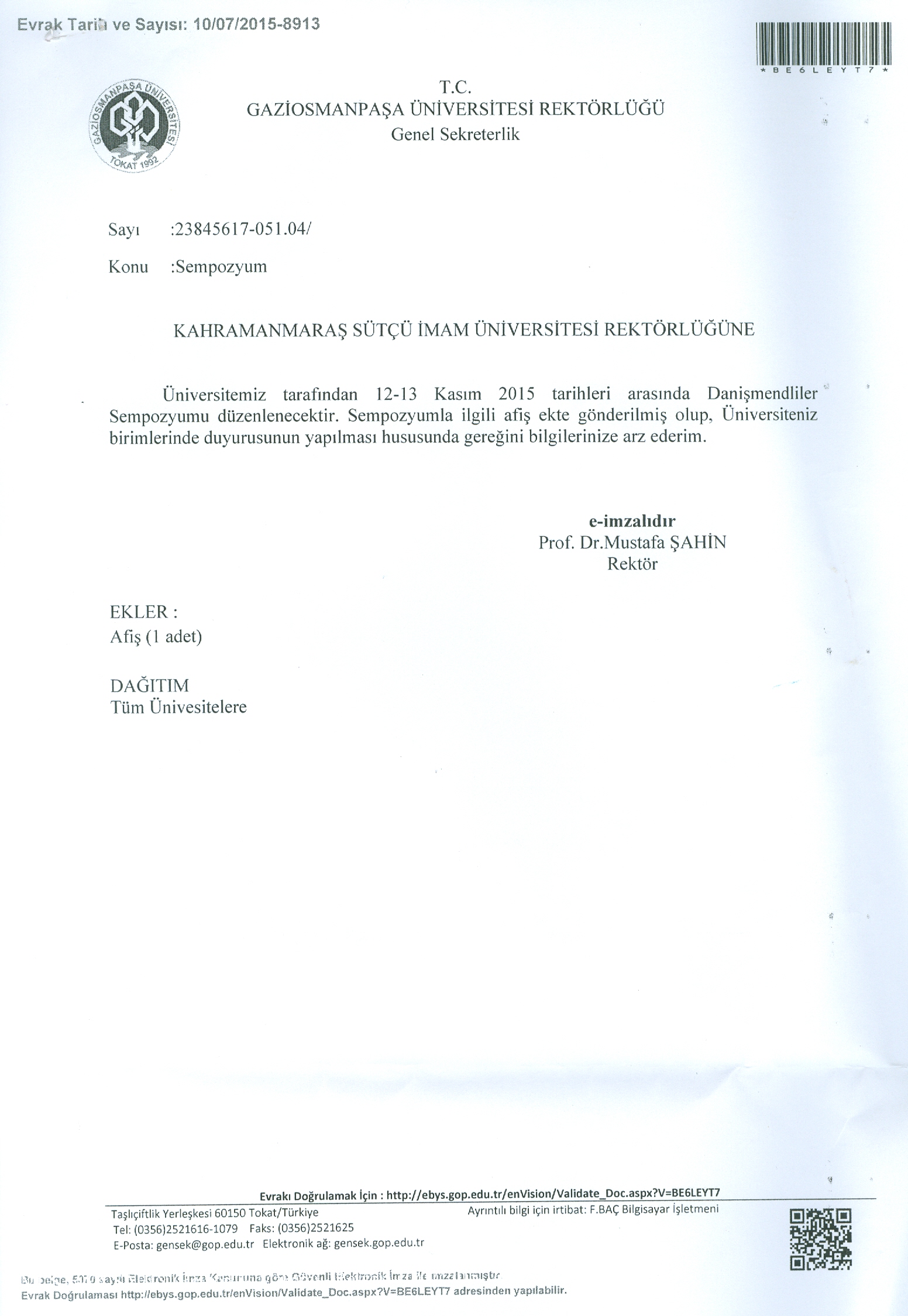 Gaziosmanpaşa Üniversitesi tarafından 12-13 Kasım 2015 tarihleri arasında düzenlenecek olan "Danişmendliler Sempzyumu"na ilişkin ayrıntılı bilgi için