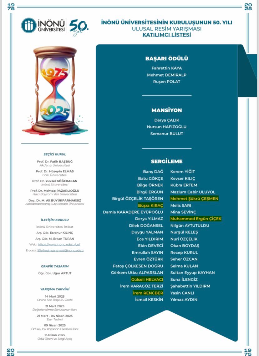 Resim Bölümü Öğretim Üyesi Mehmet Ali Büyükparmaksız hocamızın Seçici Kurulda yer aldığı yarışma; Sanat eğitimi alan öğrenciler başta olmak üzere, akademisyen, sanatçı ve sanatseverlerin katılımına açık olarak düzenlenmiş, yarışmaya Türkiye genelinde 358 sanatçı başvuruda bulunmuştur. Değerlendirme sonucunda 3 eser başarı ödülüne, 3 eser mansiyon ödülüne layık görülmüş; 40 eser ise sergilenmeye değer bulunmuştur.