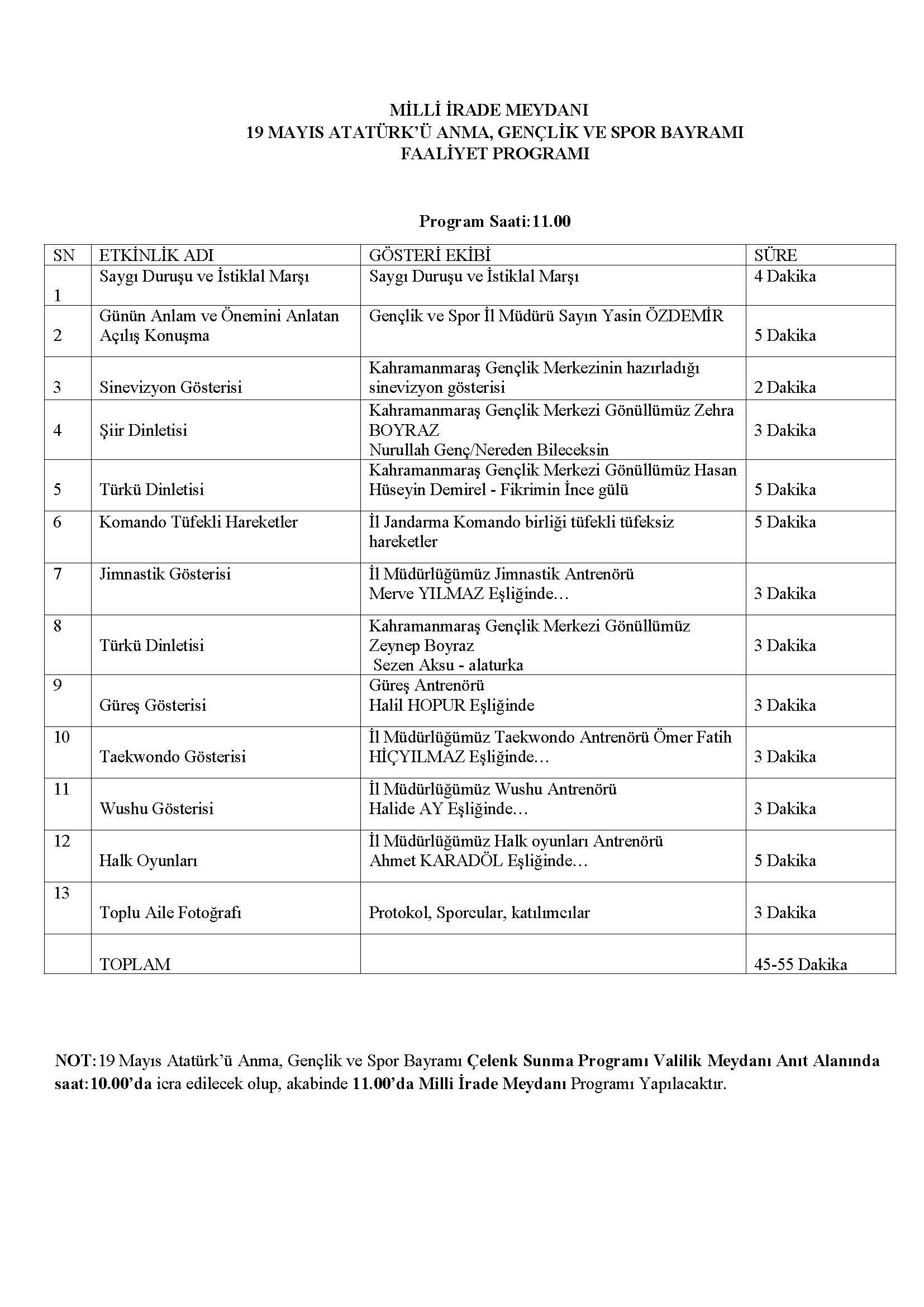 Kahramanmaraş Valiliği Gençlik ve Spor İl Müdürlüğü 19 Mayıs Atatürk'ü Anma Gençlik ve Spor Bayramı Kutlama Program Akışı