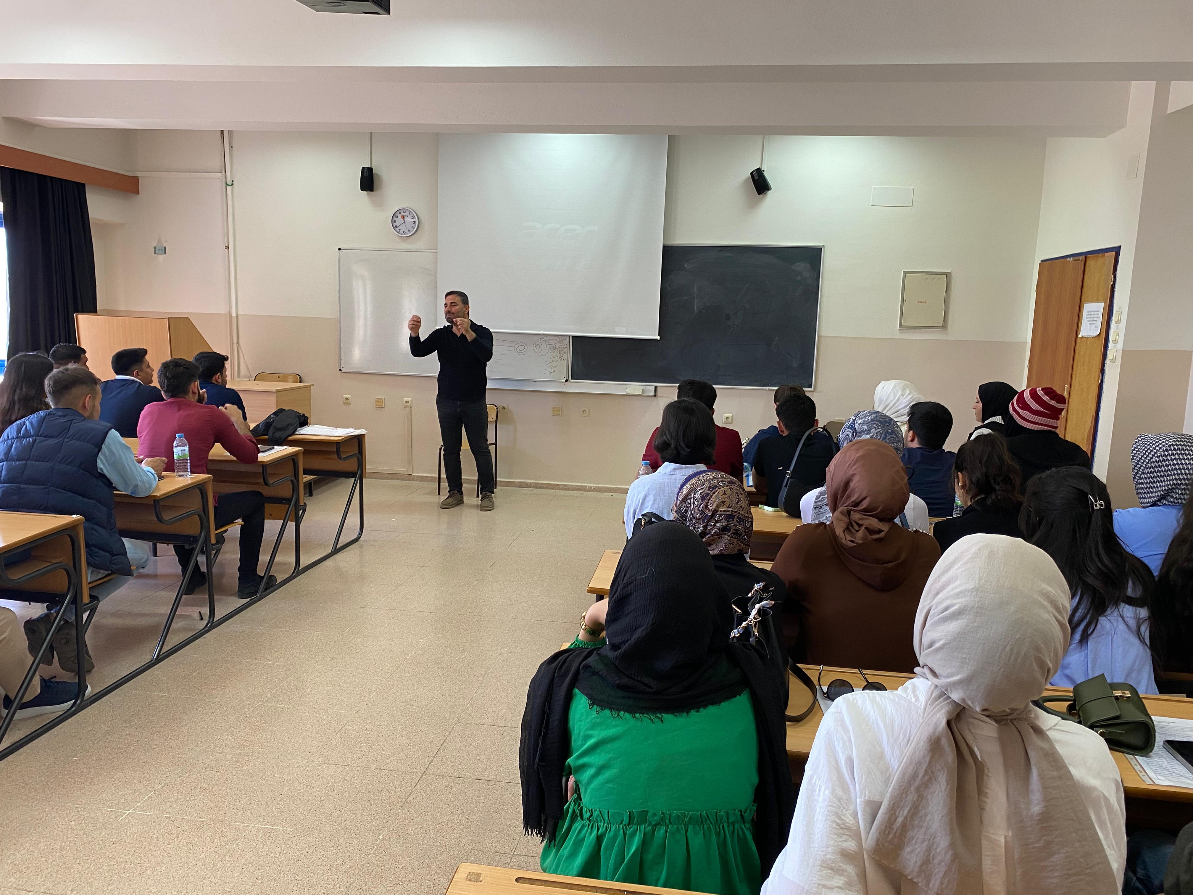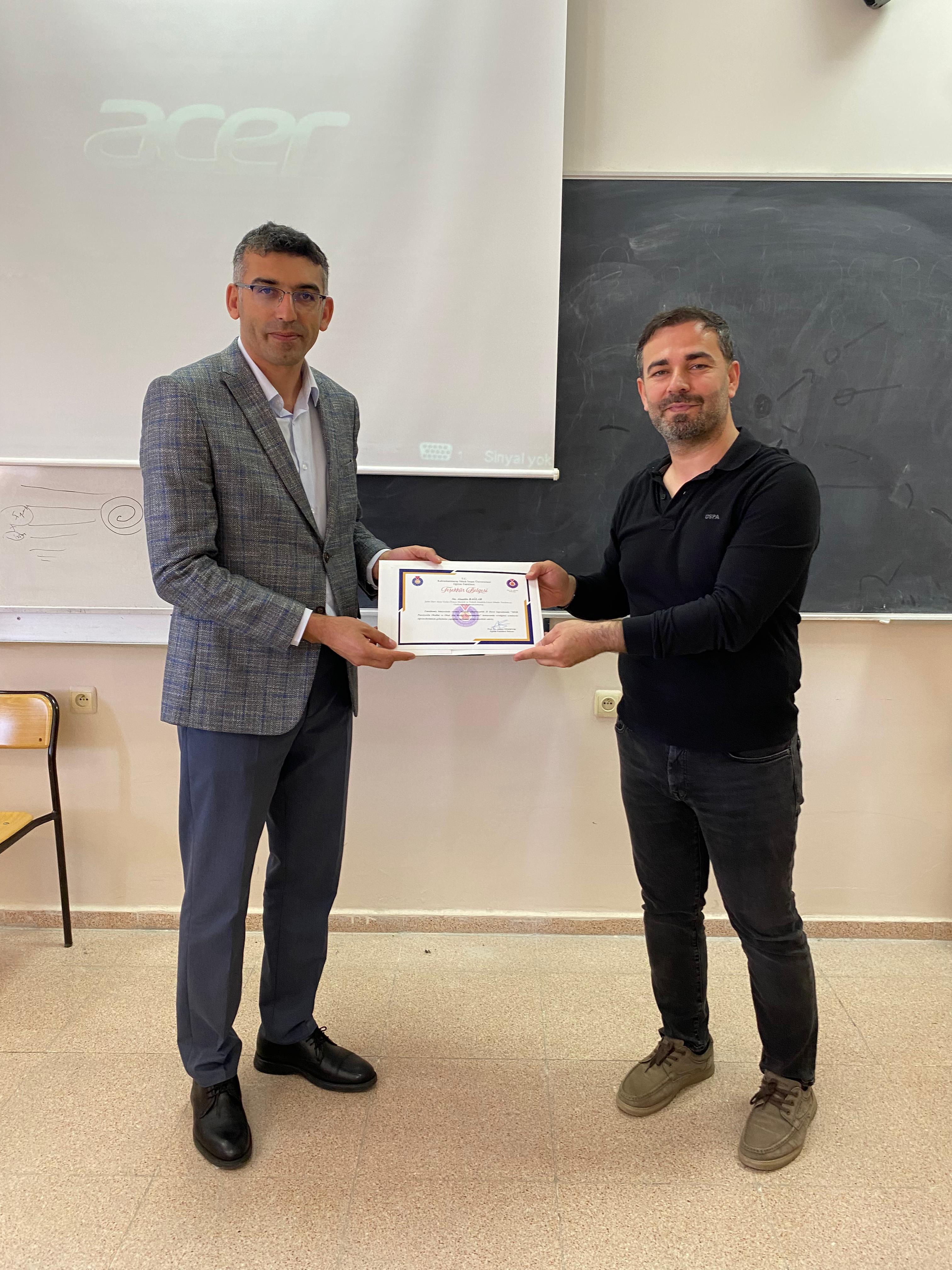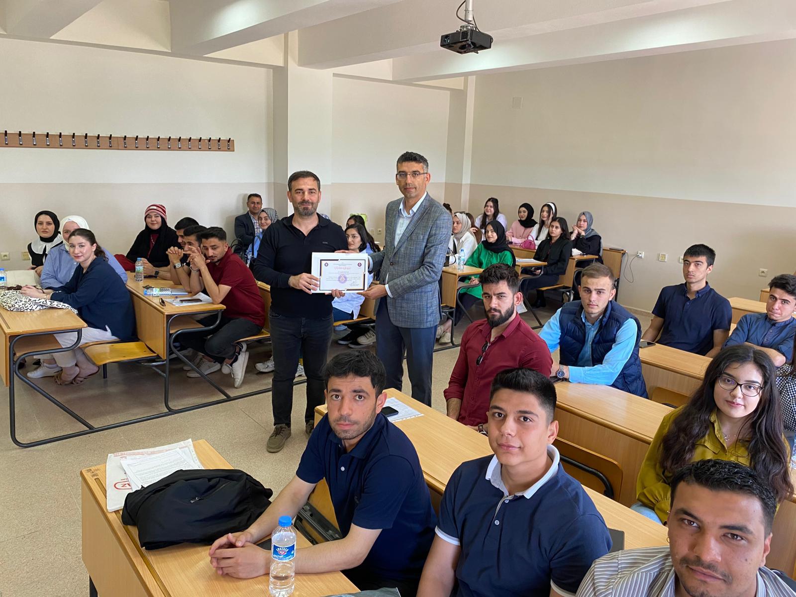 Kahramanmaraş İli Onikişubat İlçesi Şehit İdari Ateşe Galip Özmen Mesleki ve Teknik Anadolu Lisesi Müdür Yardımcısı Sayın Alaattin BAĞLAR, Fakültemiz bünyesinde Doç. Dr. Akif KÖSE tarafından yürütülen Mesleki Okuryazarlık dersi kapsamında “MEB Pansiyonlu Okullar ve Okul Aile Birliği Uygulamaları” konusunda verdiği seminerle öğrencilerimizin mesleki gelişimine katkıda bulundu. Seminer sonunda kendisine Dekan Yardımcımız Doç. Dr. Yusuf Ergen tarafından teşekkür belgesi takdim edildi.