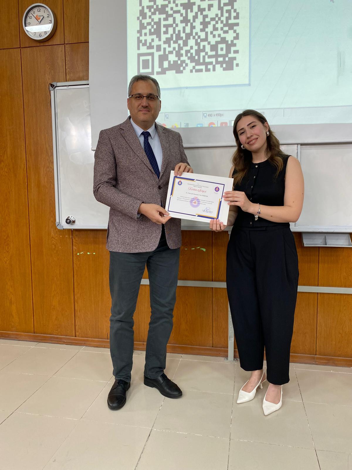 Söyleşi sonunda kendisine Dekanımız Prof. Dr. Ahmet TEKBIYIK tarafından teşekkür belgesi takdim edildi.