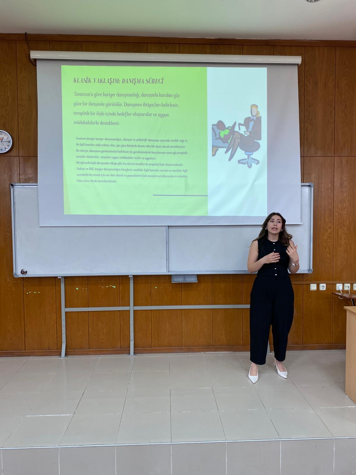 Dr. Öğr. Üyesi Emine DOĞAN tarafından fakültemiz bünyesinde yürütülen Topluma Hizmet Uygulamaları Dersi kapsamında, Psikolojik Danışman Nisa TEKBIYIK tarafından Rehberlik ve Psikolojik Danışmanlık lisans öğrencilerine yönelik kariyer planlama söyleşisi gerçekleştirildi.