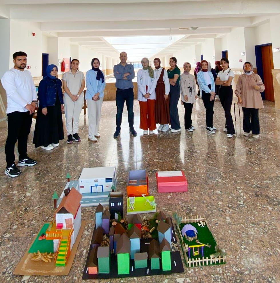 Fakültemiz öğretim üyesi Prof. Dr. İlhan İlter danışmanlığında Sosyal Bilgiler Öğretmenliği 2. sınıf öğrencileri, “Günümüz Dünya Sorunları” dersi kapsamında “Maketler ile Gerçekliğe Dokunmak” projesiyle çarpık kentleşme sorunlarına dikkat çekici bir farkındalık çalışması gerçekleştirdi. Öğrenciler, hazırladıkları maketlerle plansız şehirleşmenin fiziksel, sosyal ve çevresel etkilerini görsel olarak ortaya koydu. Geri dönüşüm malzemeleriyle yapılan maketlerde mimari düzensizlikler, yeşil alan eksiklikleri ve yaşam kalitesindeki düşüş somut bir şekilde sergilendi. Etkinlikte sadece sorunlara değil, çözüm önerilerine de yer verilerek öğrencilerin kentleşme konusunda farkındalıkları artırıldı.