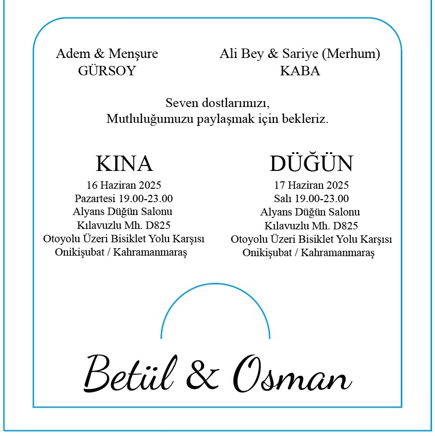 Üniversitemiz Teknik Bilimler Meslek Yüksekokulu Öğretim Elemanlarından Öğr.Gör.Osman OZAN’ın 17 Haziran 2025 Salı Günü Saat: 19.00-23.00 arası Alyans Düğün Salonunda (Kılavuzlu Bisiklet Yolu Karşısı) kendi düğünü olacaktır. OZAN Ailesini ve genç çifti tebrik eder, mutluluklar dileriz.