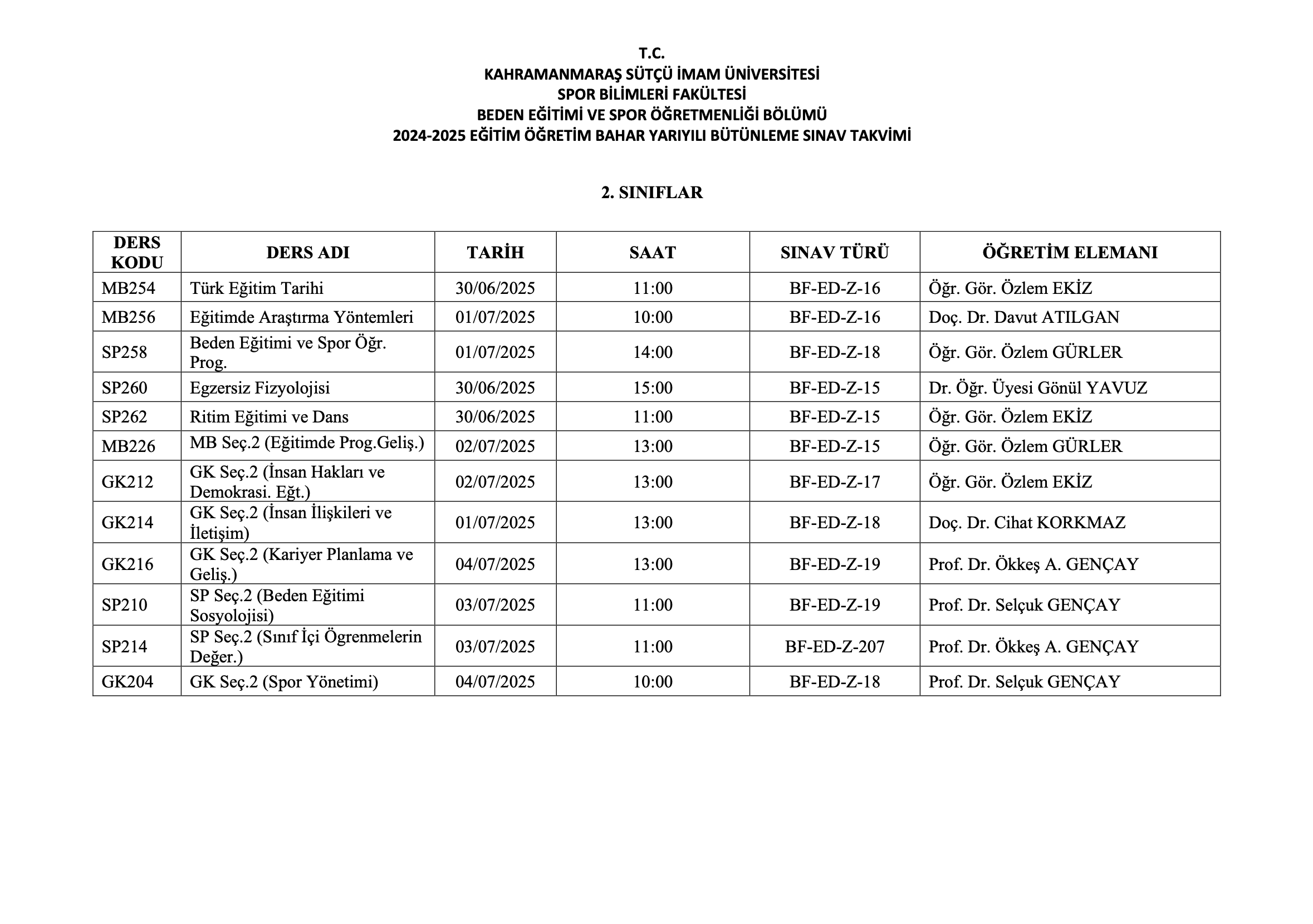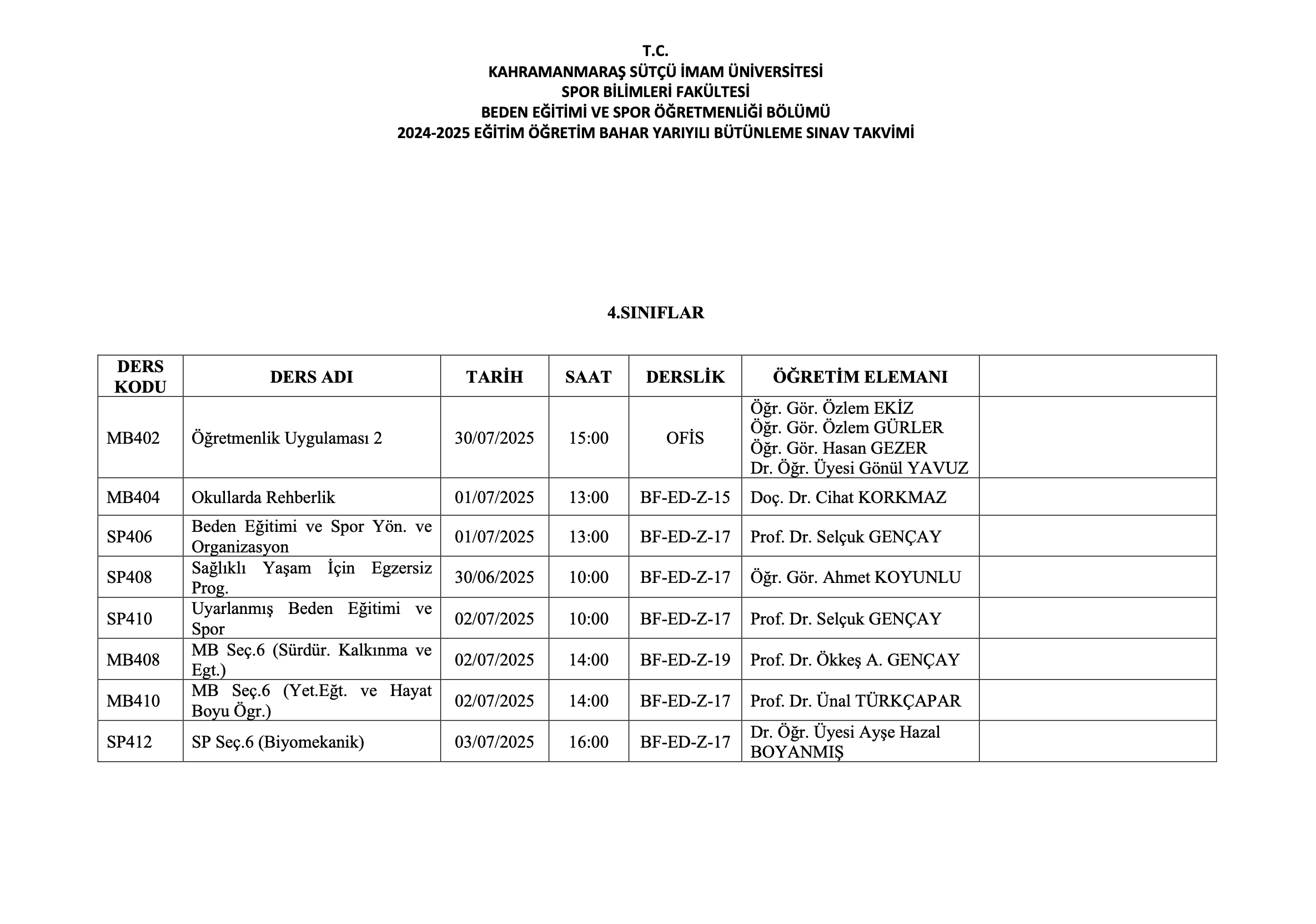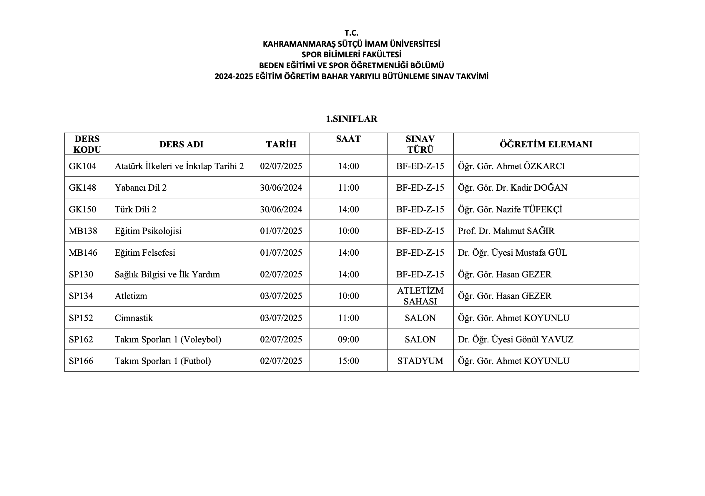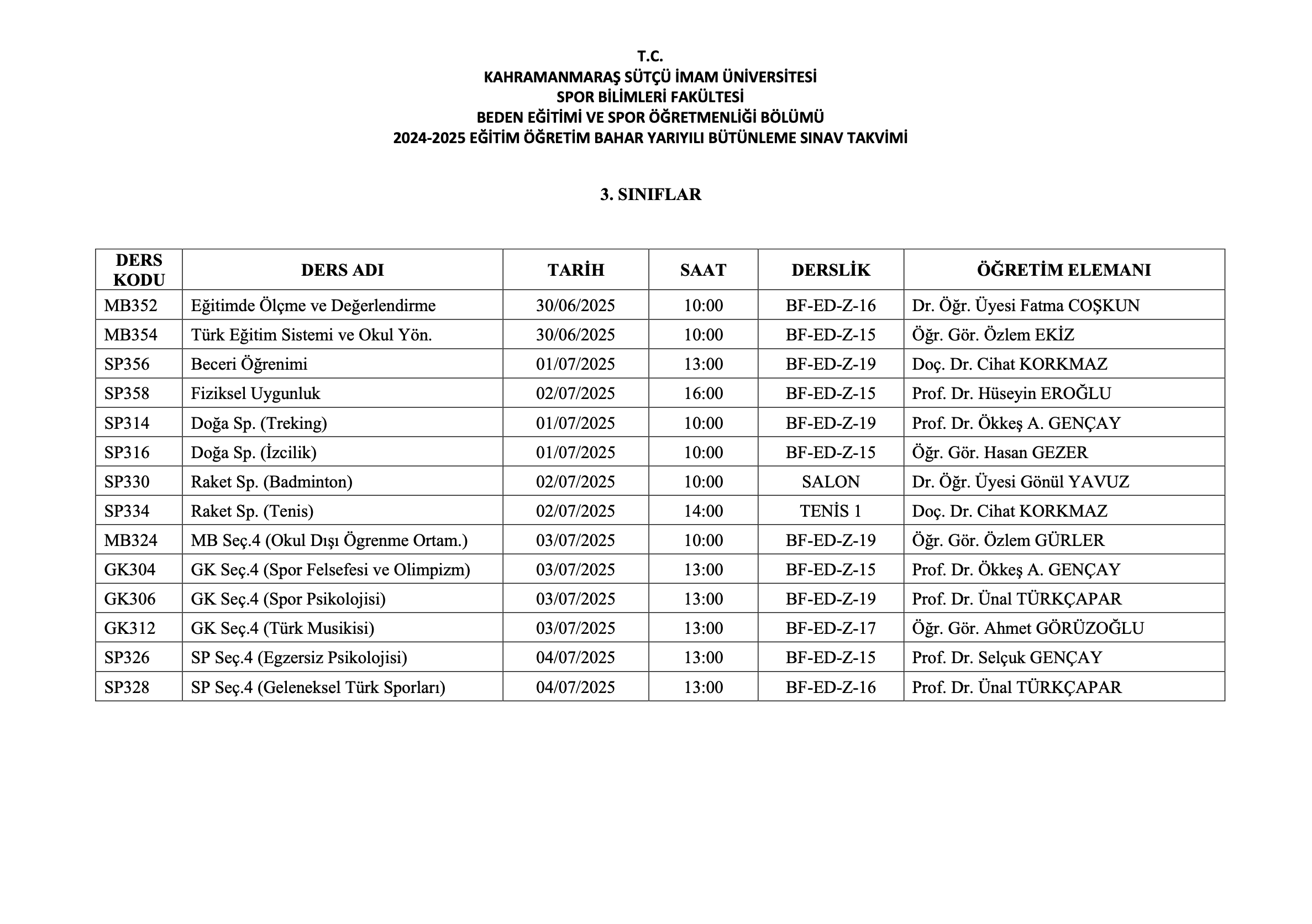 Beden Eğitimi Spor Öğretmenliği Bölümü Bütünleme Takvimi