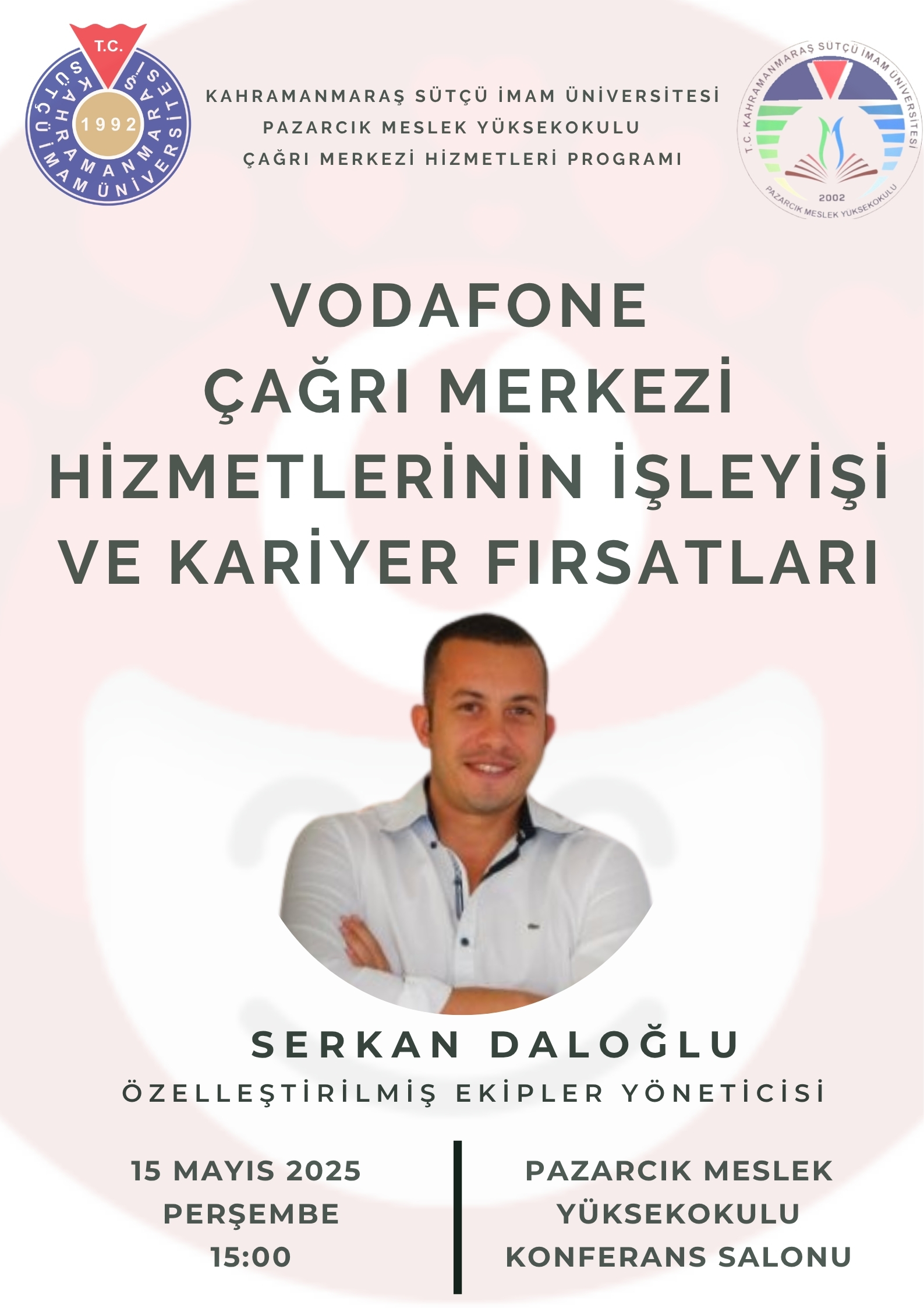 15 Mayıs 2025 Perşembe günü Pazarcık Meslek Yüksekokulu Konferans Salonu’nda gerçekleştirilen etkinlikte Sayın Daloğlu; Vodafone’un çağrı merkezi süreçleri, organizasyon yapısı ve dijitalleşme odaklı hizmet anlayışı hakkında ayrıntılı bilgiler paylaştı. Aynı zamanda öğrencilere çağrı merkezi sektöründe kariyer olanakları, işe alım süreçleri ve başarılı bir çağrı merkezi çalışanında bulunması gereken temel yetkinlikler hakkında değerli tavsiyelerde bulundu.