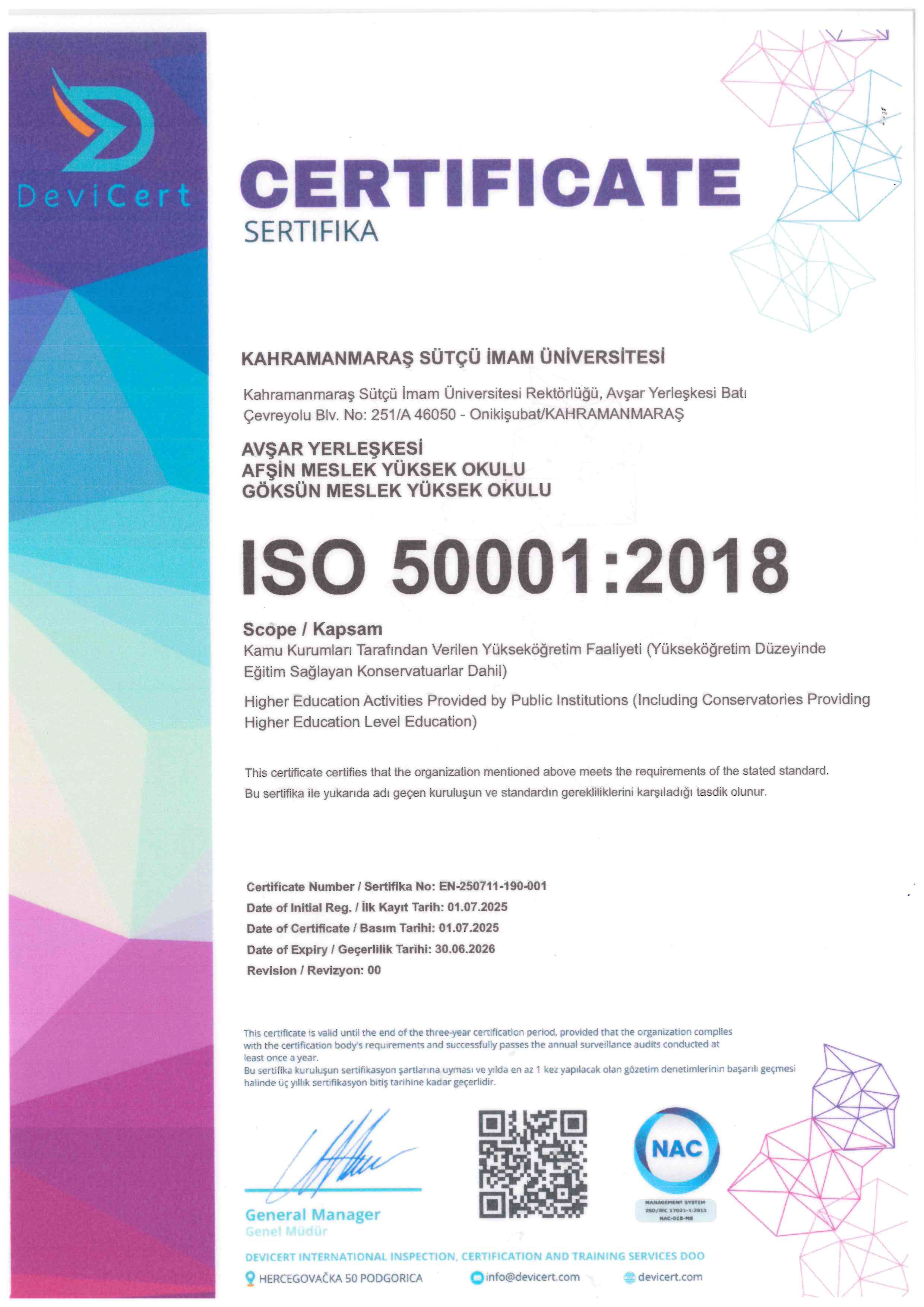 artırmak, maliyetleri azaltmak ve çevresel etkileri minimize etmek amacıyla oluşturulan uluslararası bir enerji yönetim sistemi standardı TS EN ISO 50001 Sertifikası Üniversitemize