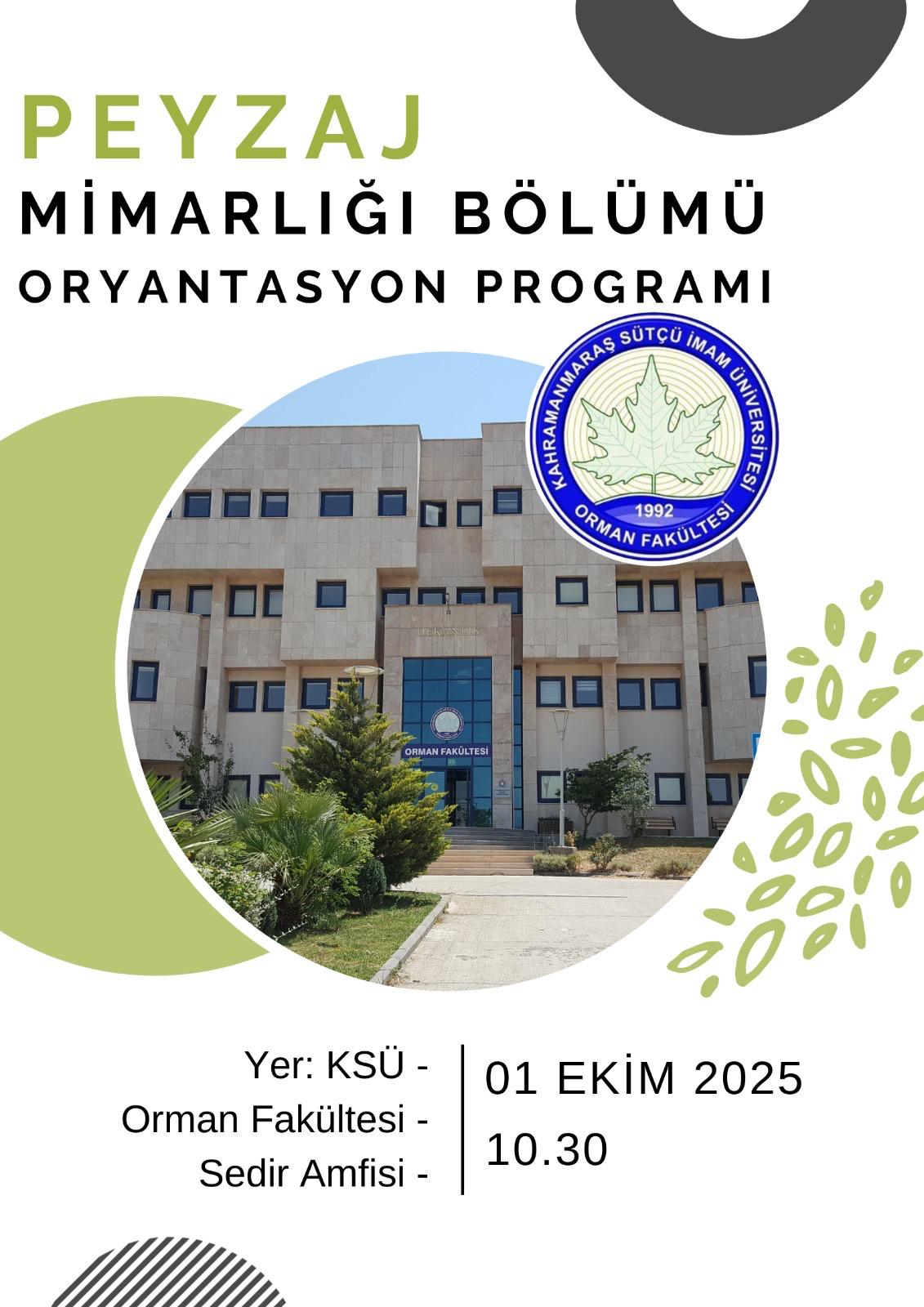 Kahramanmaraş Sütçü İmam Üniversitesi Orman Fakültesi Peyzaj Mimarlığı Bölümü tarafından düzenlenen Oryantasyon Programı, yeni öğrencilerimizin üniversite yaşamına uyum sağlamaları ve bölümü yakından tanımaları amacıyla gerçekleştirilecektir.