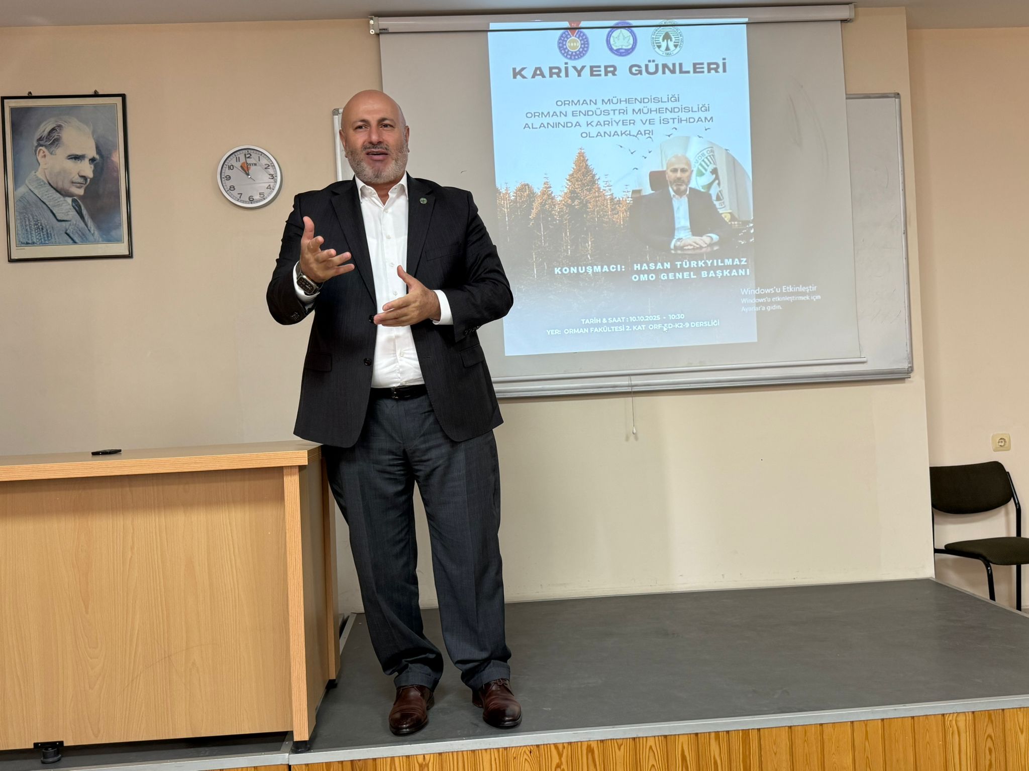 Etkinlikte Orman Mühendisleri Odası Genel Başkanı Sayın Hasan TÜRKYILMAZ "Orman Mühendisliği ve Orman Endüstri Mühendisliği Alanında Kariyer ve İstihdam Olanakları" adlı söyleşi ile öğrencilerimizi aydınlatmıştır. Öğrencilerimize kendi tecrübelerini aktararak gelecekte nasıl bir yol izleyebilecekleri hakkında bilgi vermiştir.